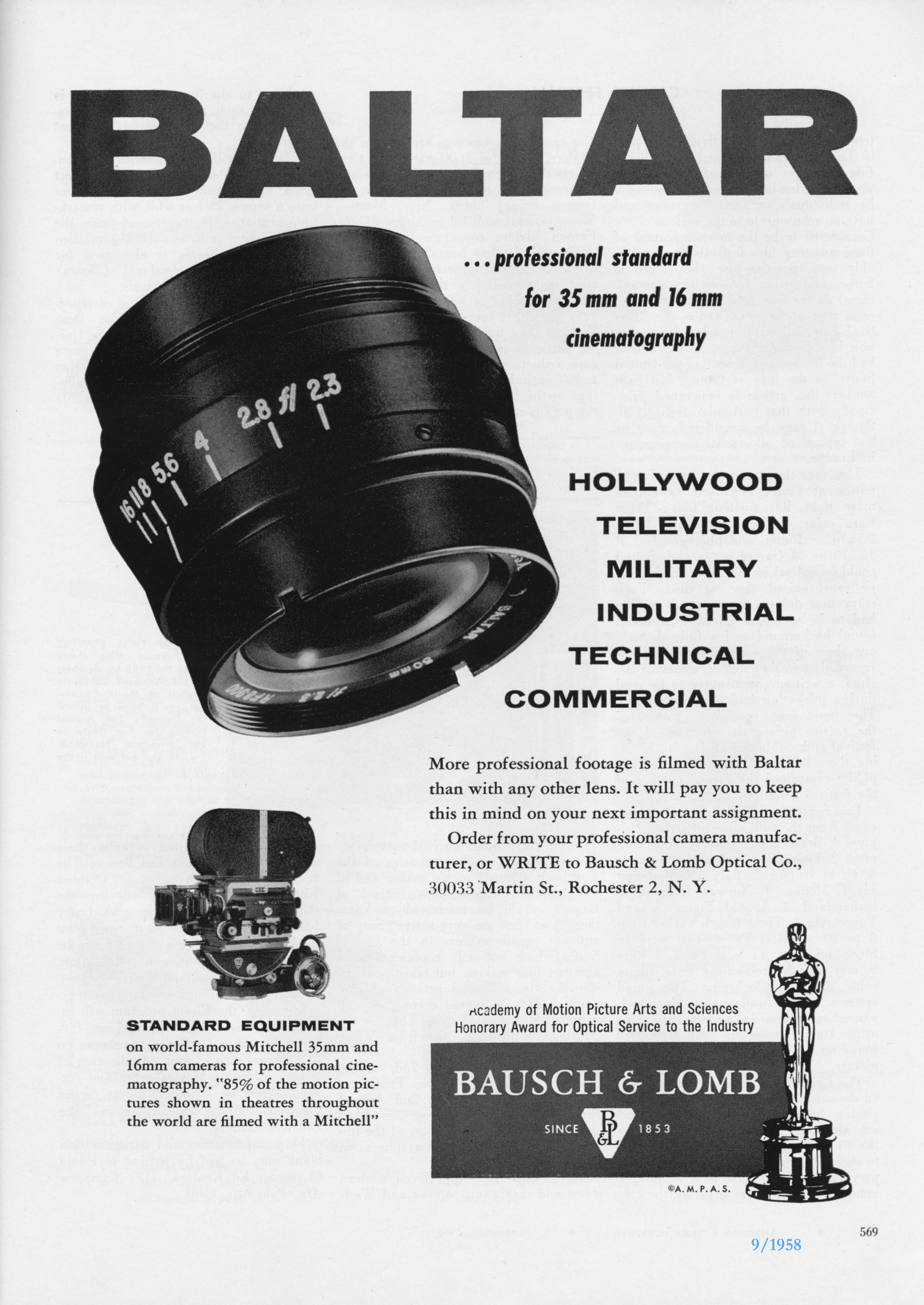 Here's an ad from from Bausch & Lomb tying the World famous 'Baltar' lens to Mitchell. The ad also repeats the Mitchell slogan: "85% of the motion pictures shown in theaters throughout the world are filmed with a Mitchell".