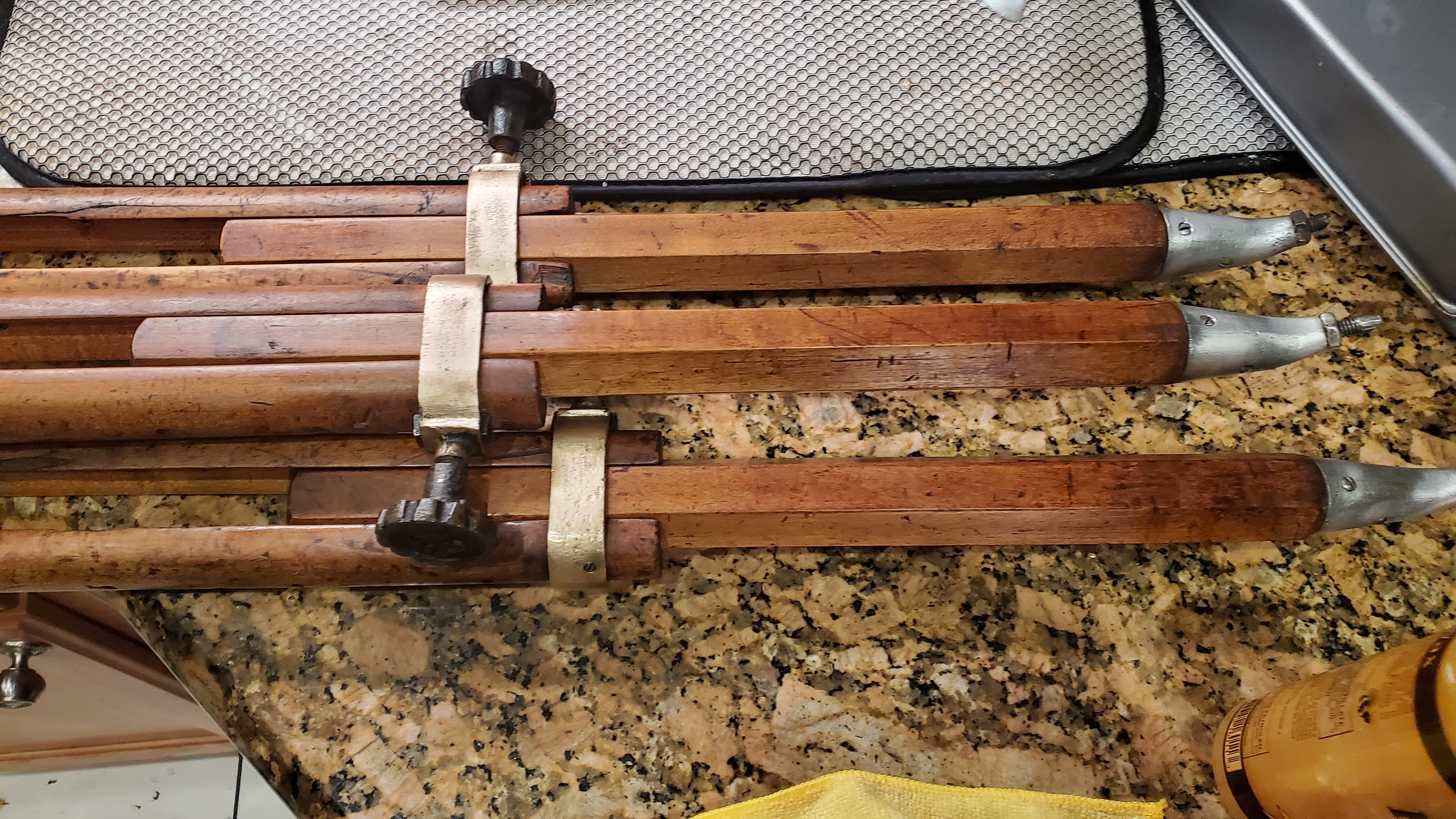 First I want to thank you in advance for your time and any information that you can provide. So I found this tripod and I'm doing minimal cleaning but this was ten times worse than you see it in the pictures doing good bug larvae and other things but I did not want to touch the patina on the wood or the bulk of the camera tripod. I will be mounting a New York City Theater spotlight on the camera mounting plate using the screws that mount it to the housing so will not be modifying any part of it. I was just wondering given the to Scheels the one on the camera mount the one on the tripod base and then those numbers that are on the ring that goes underneath the tripod if there's any information that can be found where this tripod may have been used. My email is ChefJason64@gmail.com. again I thank you for your time and any information that you provide that would help me to understand the provenance of this item.