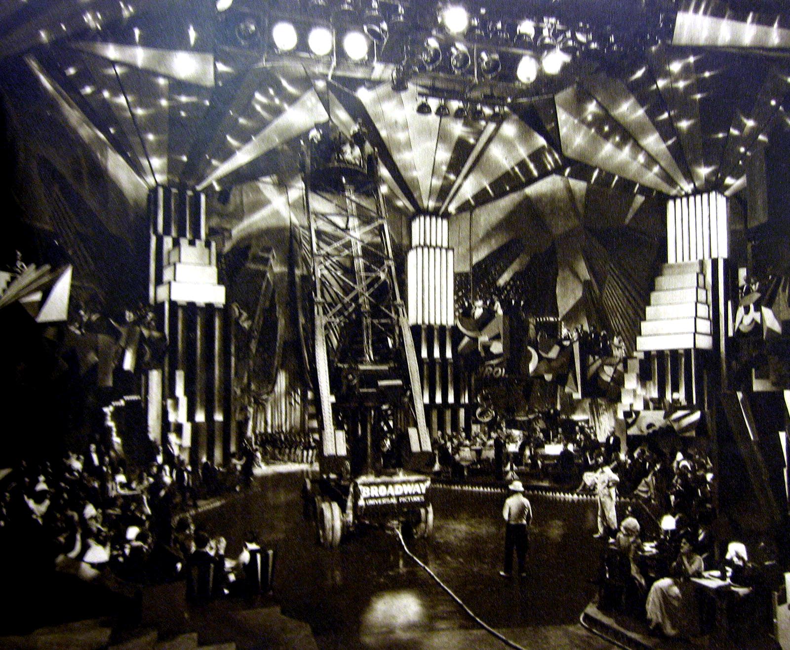 "Carl Laemmle Jr. remained enamored with Dr. Fejos, entrusted him with a big-budget all-talking adaptation of a landmark Broadway show, and gave him what he wanted most: a new toy. This was the "Broadway Crane," developed by Fejos and cinematographer Hal Mohr to allow the camera almost literally to take flight, gliding, swooping and diving across seemingly vast heights and distances. D.W. Griffith could have used something like it to film the Babylonian scenes of Intolerance, but Fejos and Mohr applied it to the story of a song-and-dance man desperate to get out of a lousy nightclub gig and break into vaudeville. To make room for the crane, the Paradise Club, named ironically in the play, becomes an Expressionist cathedral, more fit for the Phantom of the Opera than the gangsters and showgirls clamoring for attention here."