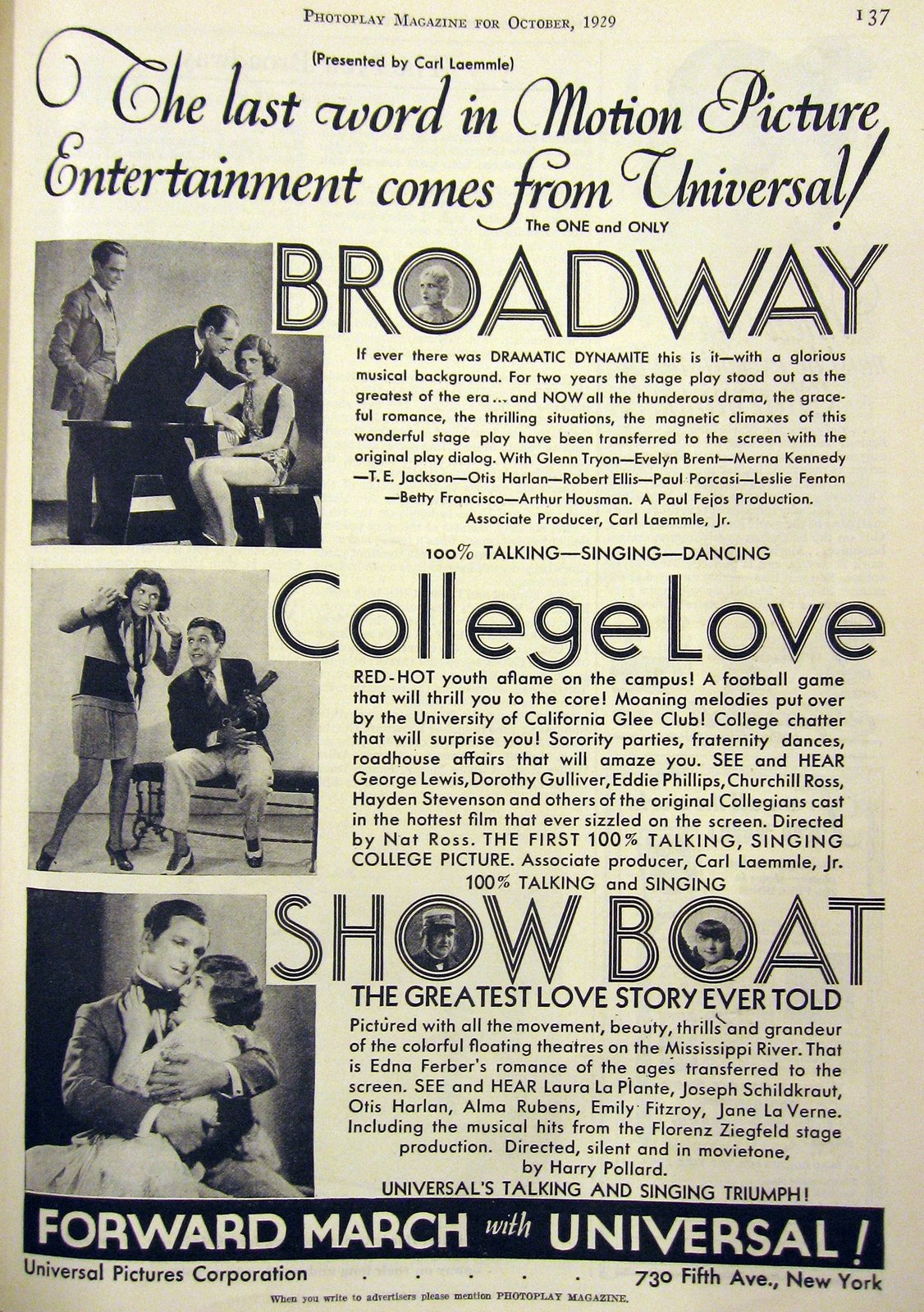 Below is a page from the magazine, Photoplay in 1929. This Universal's first talking picture.
