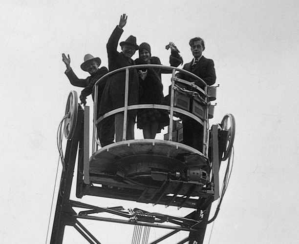 The last picture has Fajos, Mohr, Myrna Kennedy, and Universal president Carl (uncle Carl) Laemmle on the crane.