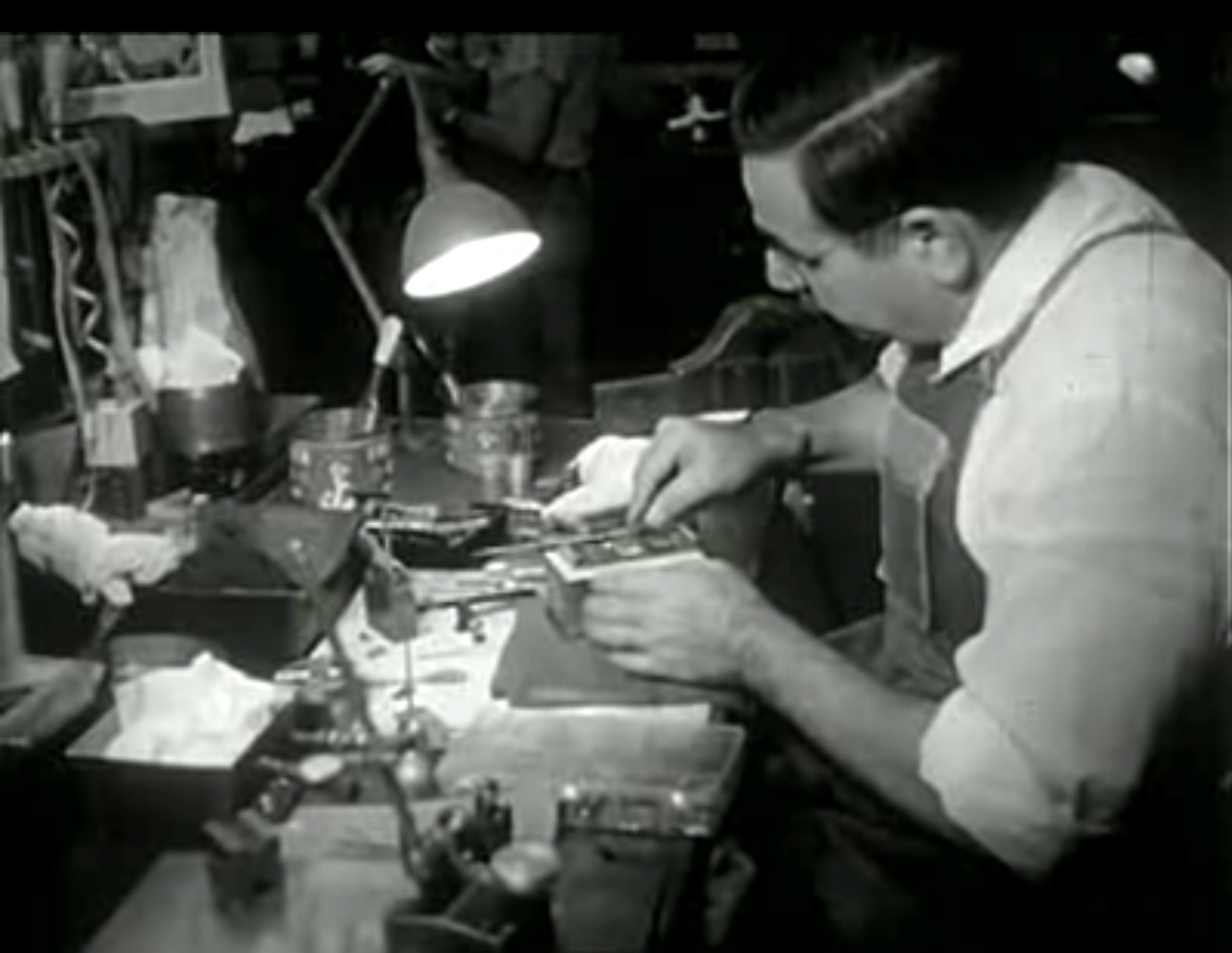 Everyone: my favorite part of this historic movie is when they feature the guy at his workbench as he fine tunes the Mitchell movement. In a phone conversation with Martin Hill 4 or 5 years ago, who as I remember lived a few blocks away from the Mitchell factory. Martin told me he used to walk into the factory and hang out and subsequently got to know the machinists. He told me each machinist built a single Mitchell camera from start to finish and that person had his own assigned workbench with all his own tools. I don't know the name of the person in this shot but I can only imagine how many Mitchells he must of built.