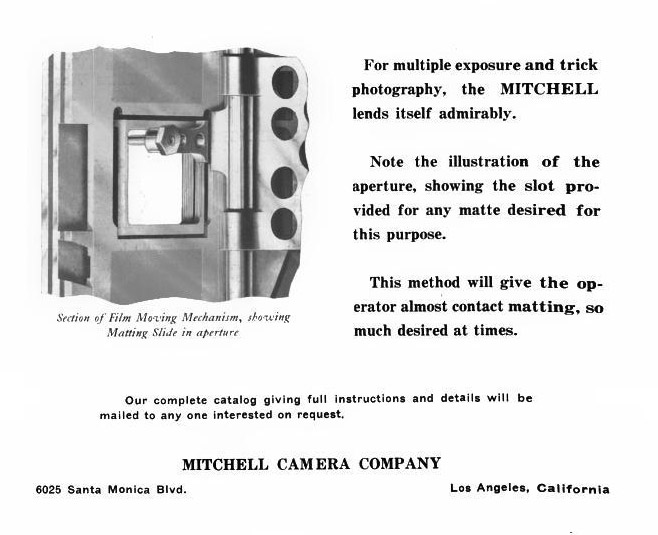 Thanks for the ads on the matte wheel! Fortunately my Standard still has the matte wheel as they are often removed from the cameras. My camera also has an adjustable length auto disolve, but this was disabled. I am trying to restore that function. I have also seen other parts removed, like on a BNC owned by Paramount Studios; they had removed the portion of the follow-focus that extends to the rear of the camera. I was told that studios did these things to prevent accidental usage. It would ruin a shot if the fade out button was accidentally hit during a scene, or if the camera operator accidentally hit the follow-focus. Makes sense, after all these are tools to make movies.
