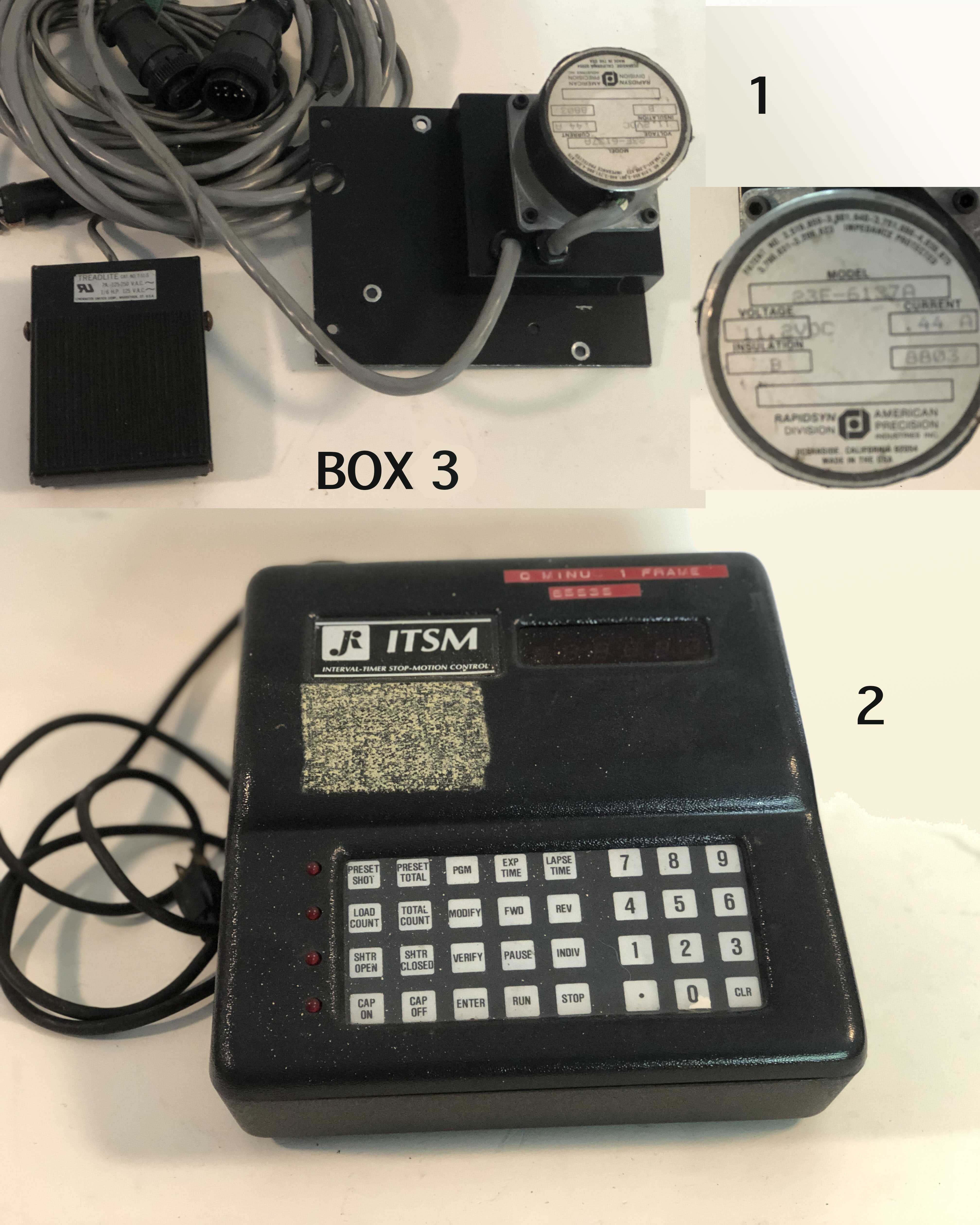 Box 3 is a complete animation setup with foot control. Some people may have an interest as would be the case with the #3 more recent Norris animation setup if either are functional- they can be modified for other cameras.