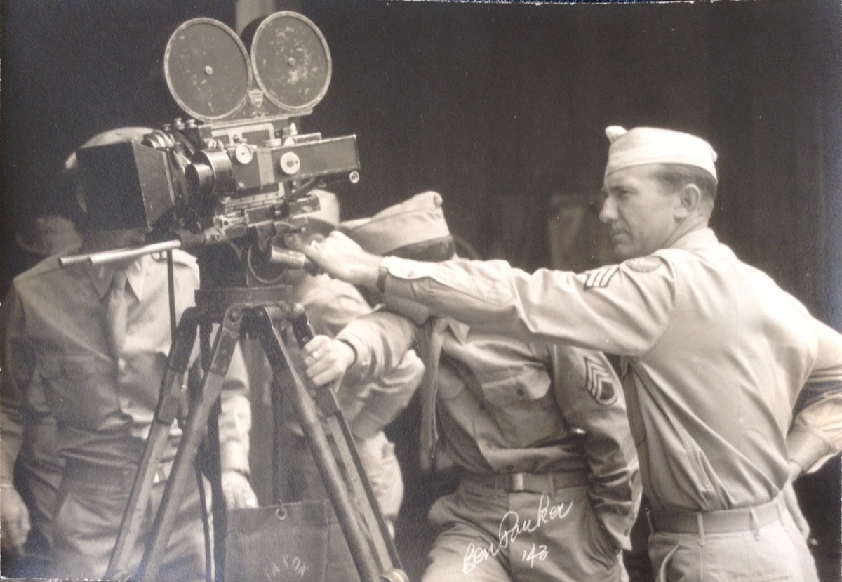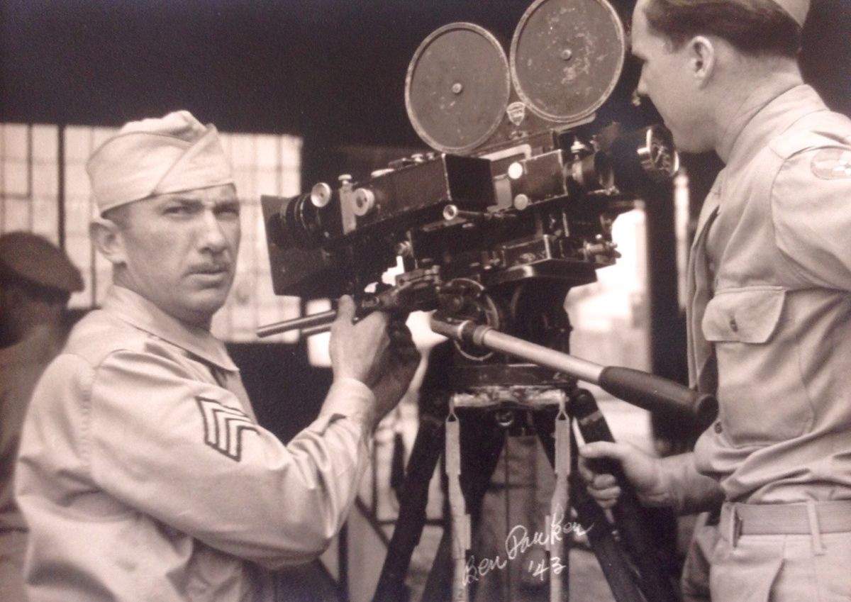 Looks to be a Mitchell Standard. It has both the adjustable 4 way matte and iris controls on the front. Looks like a high speed motor from the tach. The tripod and head are also Mitchell. Parker could have become a director after the war based on his experience. Lots of people in the film industry served at all levels and in many capacities during the war. The major studios all had memorials to employees lost in action. Hope this helps. ED.