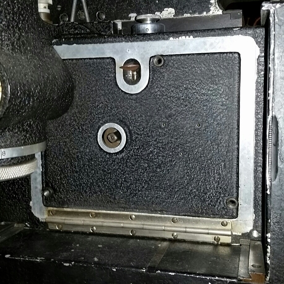 Here are few shots of my Standard #333 (with a "Los Angeles" badge, predating West Hollywood)... the crank side door has been modified to take a motor drive (not a usual Mitchell motor, but some other device), and the flywheel has been removed, indicating that # 333 was most recently used for animation, since the flywheel would cause a stutter, even at a rate of one frame. The automatic variable shutter is intact, and the L-base still has the built-in iris (positionable in frame), the built in matte curtains and the matte/effects wheel, and it has an uncommon early ("Los Angeles" badge) Mitchell sidefinder.