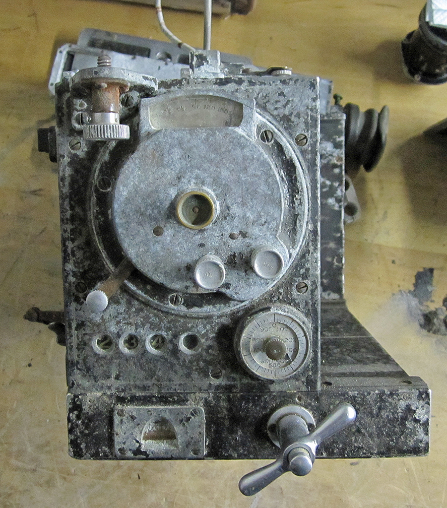 Mitchell Standard ( real standard ) no. 421 Army 1941, is very corroded , rack over stuck , one nikon mount, no matte wheel, movement and camera numbers match, Dissolve speed knob and linkage are there , back of camera is right for a standard, lever and buttons stuck. movement has metal gears , motor side main gear in fiber, so maybe paritcal high speed ? 400 ft mag also bad shape. found in storage . Very bad shape