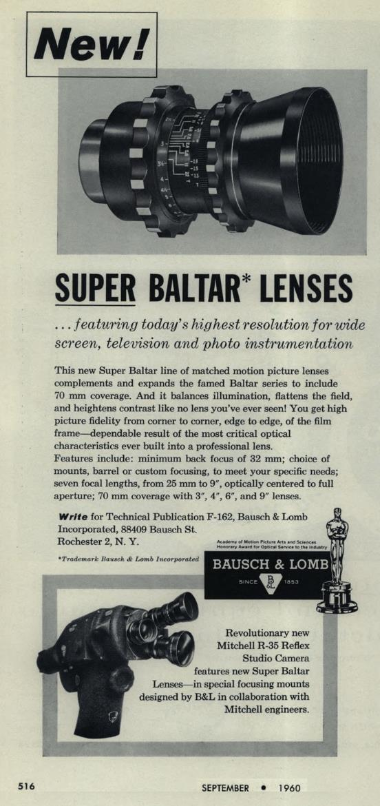 Several months before launch, Bausch and Lomb ran a complementary ad about the new Super Baltars available in the new Mitchell Bayonet mount developed for the 35-R