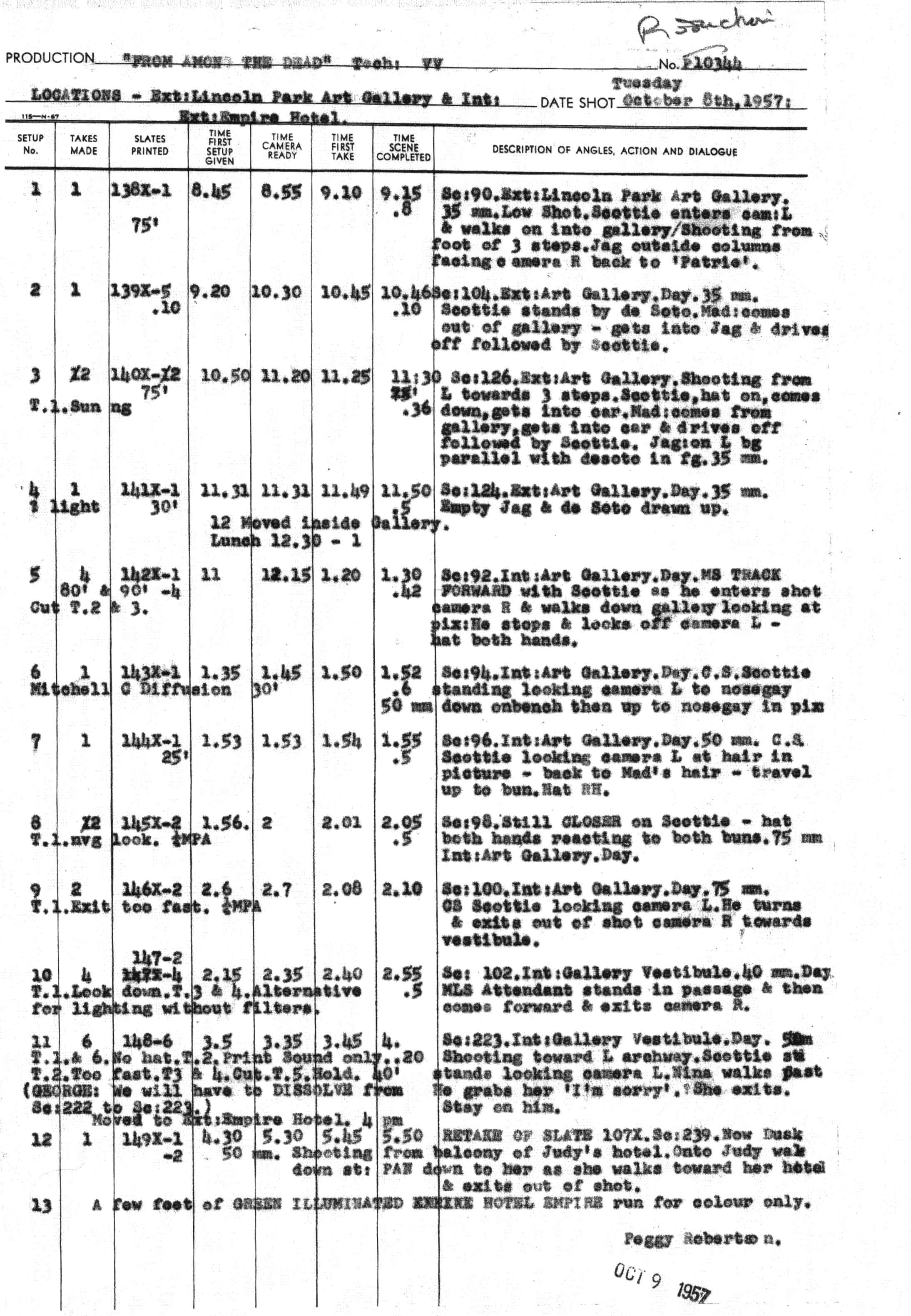 In this case, camera MVV-7 filmed scene 138X. In the script notes you can see that in scene 138X they used a 35mm lens, it was an exterior shot at Lincoln Park Art Gallery. It further shows that it was a low shot where "Scottie" (Jimmy Stewart) enters the scene from camera Left and walks into the gallery. You can match this up to the movie and know exactly which camera filmed it! This particular camera was one of several location cameras used in San Francisco, Big Basin and San Juan Batista. It was used with the direction Hitchcock himself as well as the second unit director.