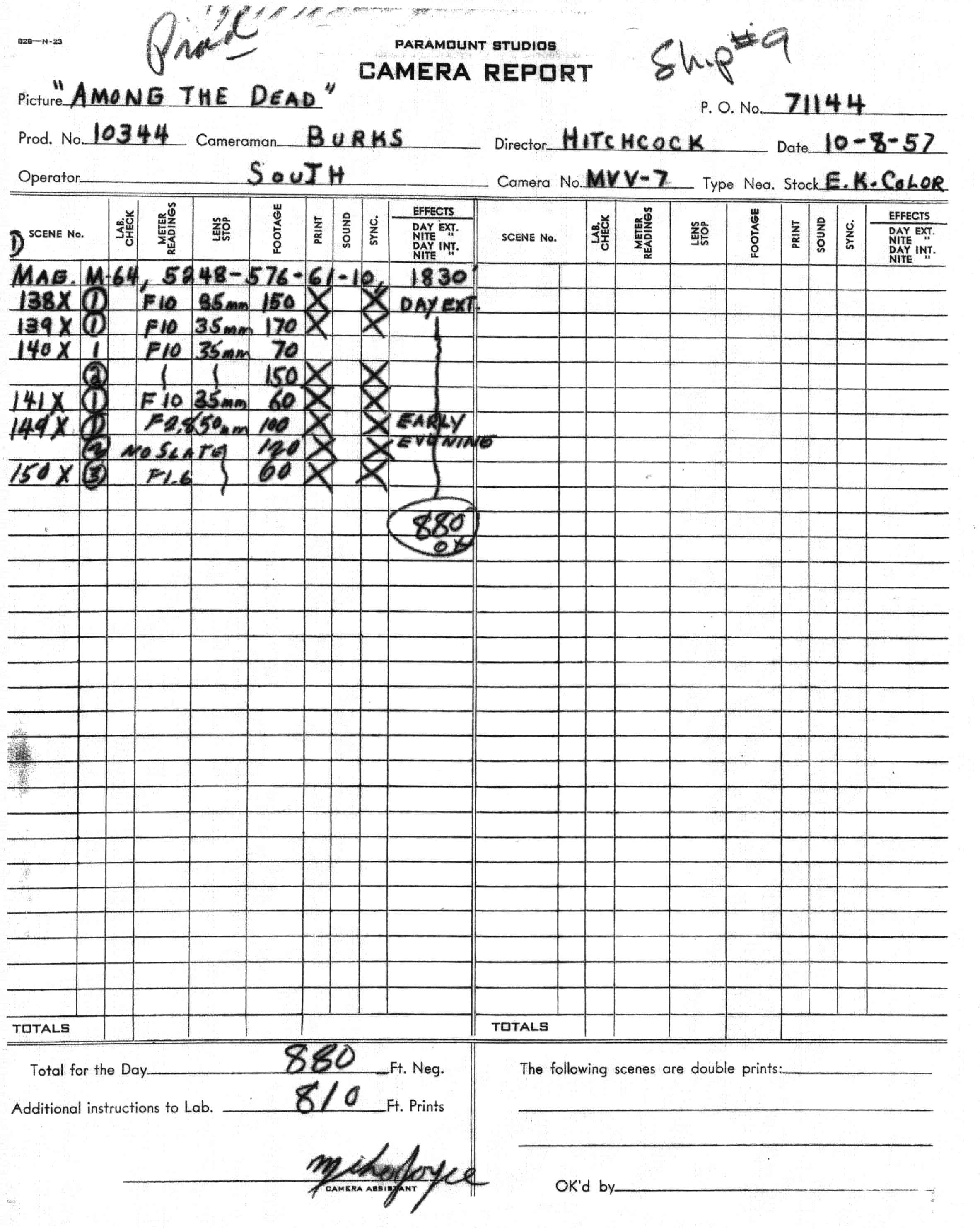 Camera Reports; I have not worked in the industry so my information my be lacking, but this is what I have learned: A camera report is for an individual camera for each day it was used on a production. Basically it documents the production info, scene numbers filmed, amount of footage exposed, and other information (see photo). These records were kept by the studio for various amounts of time. Most have since been dumped, some are in a few film related libraries. They are the single best piece of evidence that one can have to show the history of a camera. In the case of the camera report in the photo, it is for the movie "Among the Dead", which was the working title for Vertigo, 1958, directed by Alfred Hitchcock.